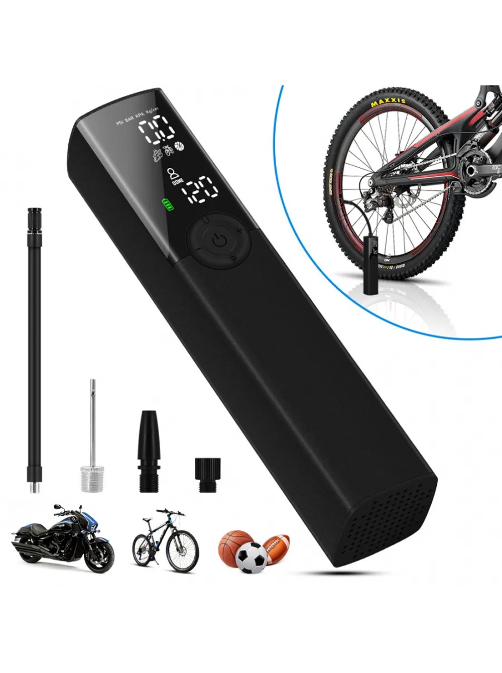 | Описание | На лицевой стороне расположен информативный дисплей, отображающий текущую информацию: уровень заряда аккумулятора, выбранный режим и давление. В меню есть 4 режима работы, которые переключаются одним нажатием. Производительность компрессора 20 л/мин. Давление: 130-160PSI. Автоматически отключается при достижении максимального давления. Мощный фонарик. Насосом можно накачать шины как обычного, так и шоссейного велосипеда, шины мотоцикла, автомобильные шины, надувные лодки и т.д. |